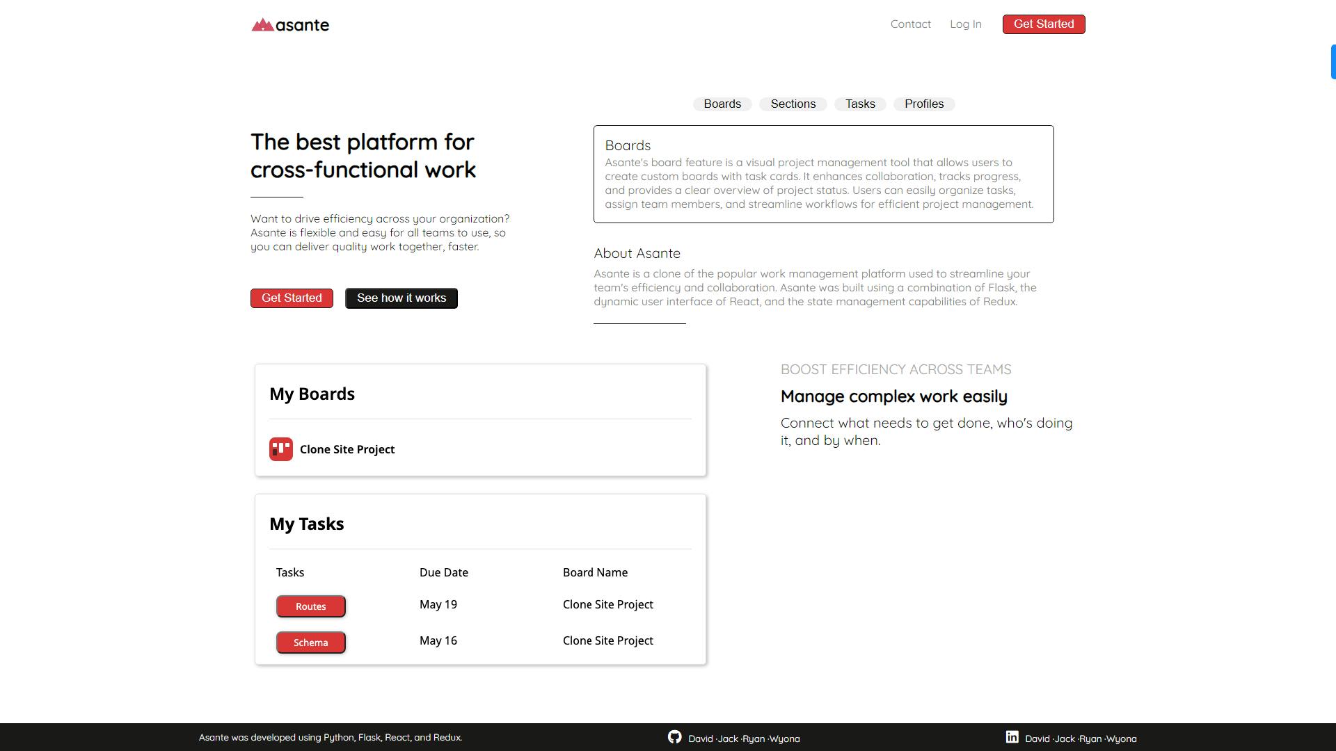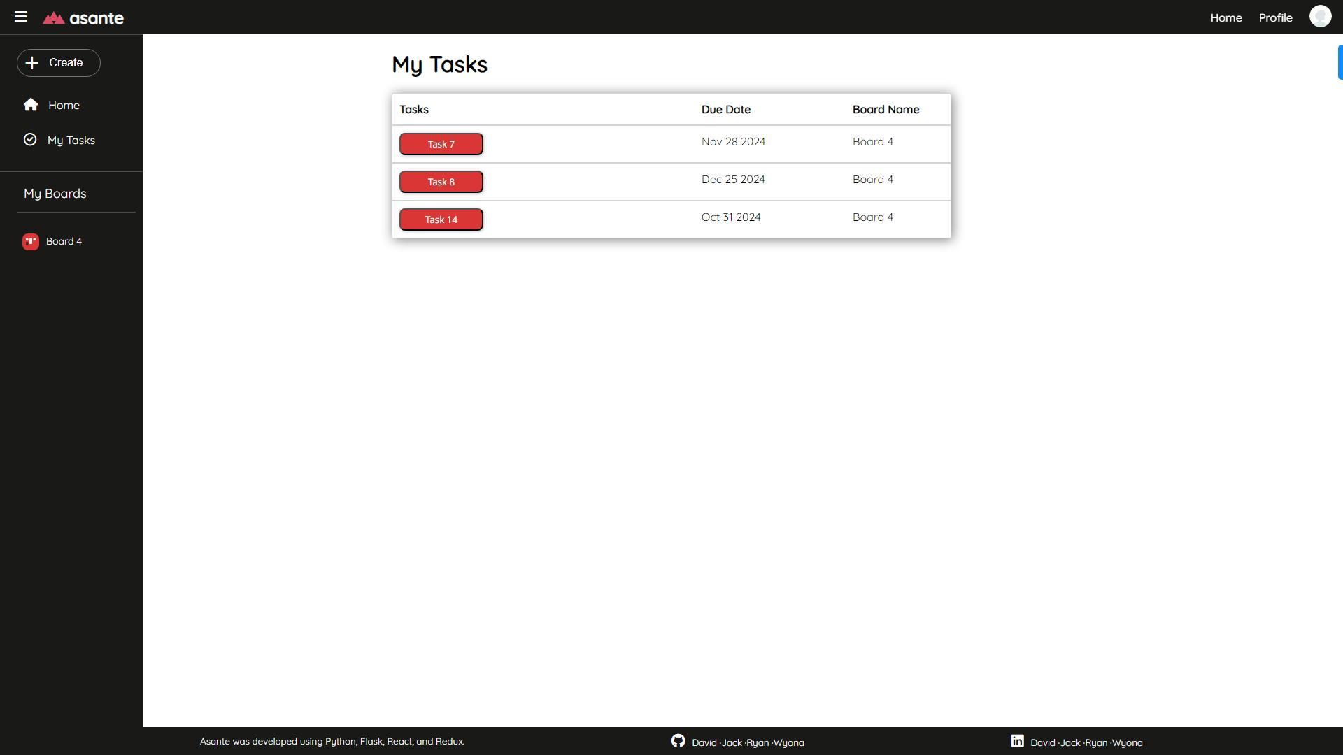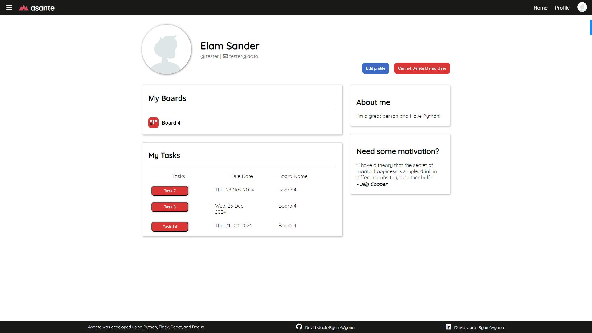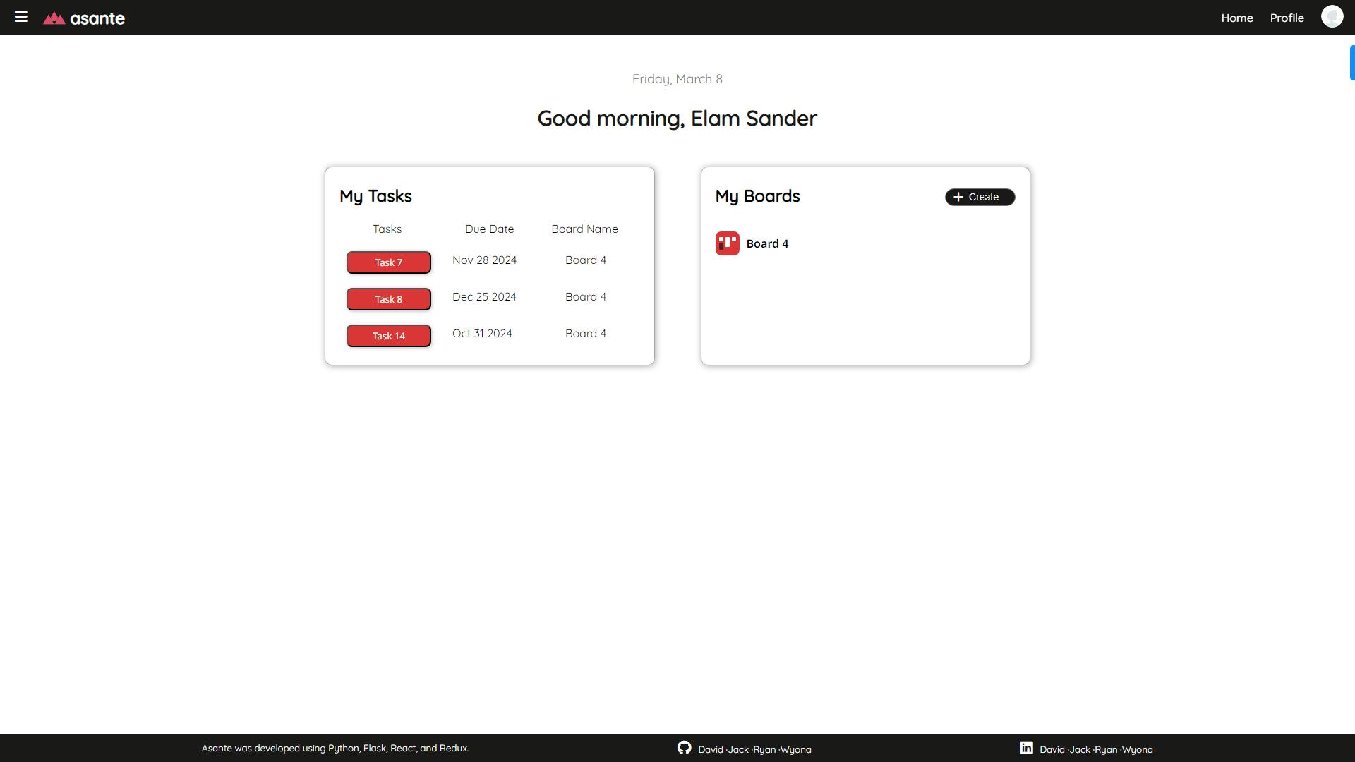 Asante is a project management web application that is a comprehensive platform that allows users to efficiently manage their tasks and projects. Users can create project boards, each containing customizable sections and tasks, with full CRUD (Create, Read, Update, Delete) functionality.